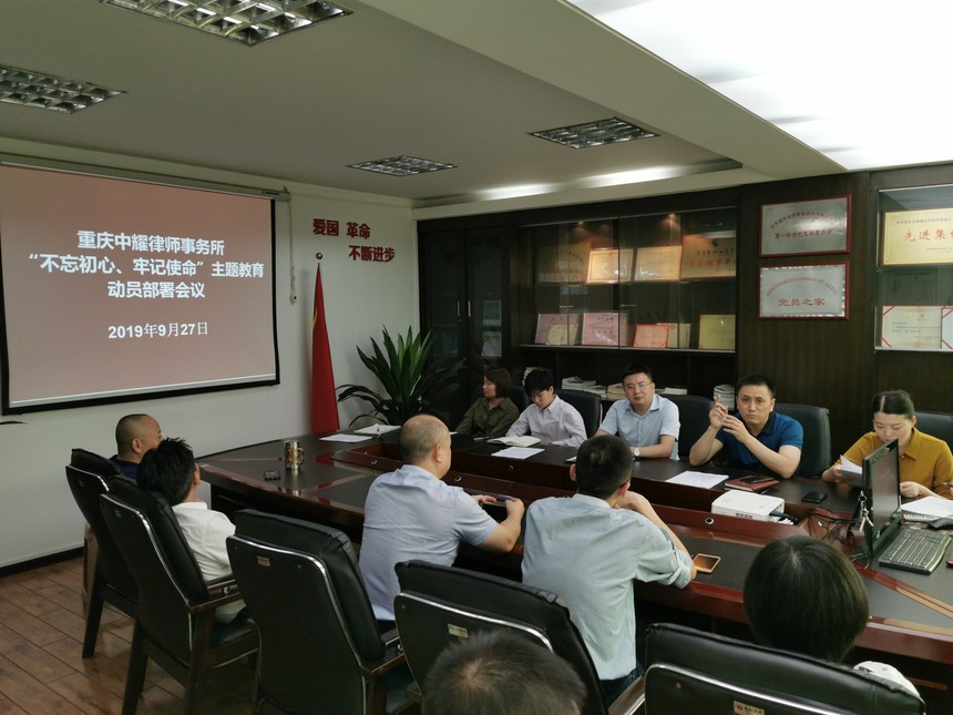 “不忘初心、牢记使命”主题教育动员部署会议以各级党委和司法行政机关的总体部署和安排为指导,结合我所支部刚刚成立的实际情况,9月27日下午,我所全体党员律师及律师庆祝新中国成立70周年,扎实开展好“不忘初心、牢记使命”主题教育。总要求是守初心、担使命、找差距、抓落实;根本任务是深入学习贯彻新时代中国特色社会主义思想,锤炼忠诚干净担当的政治品格;具体目标是理论学习有收获、思想政治受洗礼、干事创业敢担当、为民服务解难题、清正廉洁作表率。借此主题教育活动为契机,进一步规范律所的党建工作,提升律所党员律师的党性意识和责任担当,增强全所律师的凝聚力、向心力,持续推动律所的全面建设和健康发展。